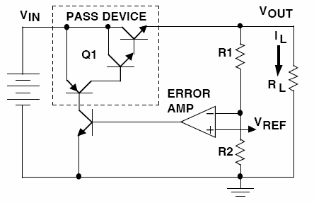 Điện áp ra VOut trên tải RL sẽ được phân áp qua R1R2 để đưa về so sánh tại Mạch Khuyếch đại Thuật toán Error Amp sao cho nếu điện áp ra trên tải càng tăng lên thì điện áp ra của Mạch Khuyếch đại Error Amp sẽ càng giảm khiến cho Transistor NPN ghép trực tiếp với Error Amp sẽ càng giảm dòng điện qua nó vì thế kéo theo làm giảm Cường độ dòng điện qua Transistor PNP cung cấp dòng cho cặp Darlington Q1 vì thế dòng điện qua Q1 cũng sẽ giảm theo khiến cho điện áp ra trên tải RL sẽ giảm theo vì điện áp này là tích số của I1 qua Q1 với trở kháng của tảo RL.